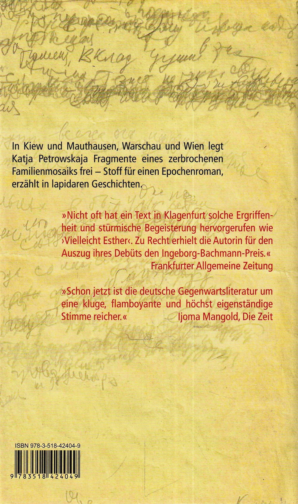 Hiess sie wirklich Esther, die Grossmutter des Vaters, die 1941 im besetzten Kiew allein in der Wohnung der geflohenen Familie zurückblieb? Die jiddischen Worte, die sie vertrauensvoll an die deutschen Soldaten auf der Strasse richtete – wer hat sie gehört? Und als die Soldaten die Babuschka erschossen, »mit nachlässiger Routine« – wer hat am Fenster gestanden und zugeschaut? Die unabgeschlossene Familiengeschichte, die Katja Petrowskaja in kurzen Kapiteln erzählt, hätte ein tragischer Epochenroman werden können: der Student Judas Stern, ein Grossonkel, verübte 1932 ein Attentat auf den deutschen Botschaftsrat in Moskau. Sterns Bruder, ein Revolutionär aus Odessa, gab sich den Untergrundnamen Petrowski. Ein Urgrossvater gründete in Warschau ein Waisenhaus für taubstumme jüdische Kinder. Wenn aber schon der Name nicht mehr gewiss ist, was kann man dann überhaupt wissen? Statt ihren gewaltigen Stoff episch auszubreiten, schreibt die Autorin von ihren Reisen zu den Schauplätzen, reflektiert über ein zersplittertes, traumatisiertes Jahrhundert und rückt Figuren ins Bild, deren Gesichter nicht mehr erkennbar sind. Ungläubigkeit, Skrupel und ein Sinn für Komik wirken in jedem Satz dieses eindringlichen Buches.