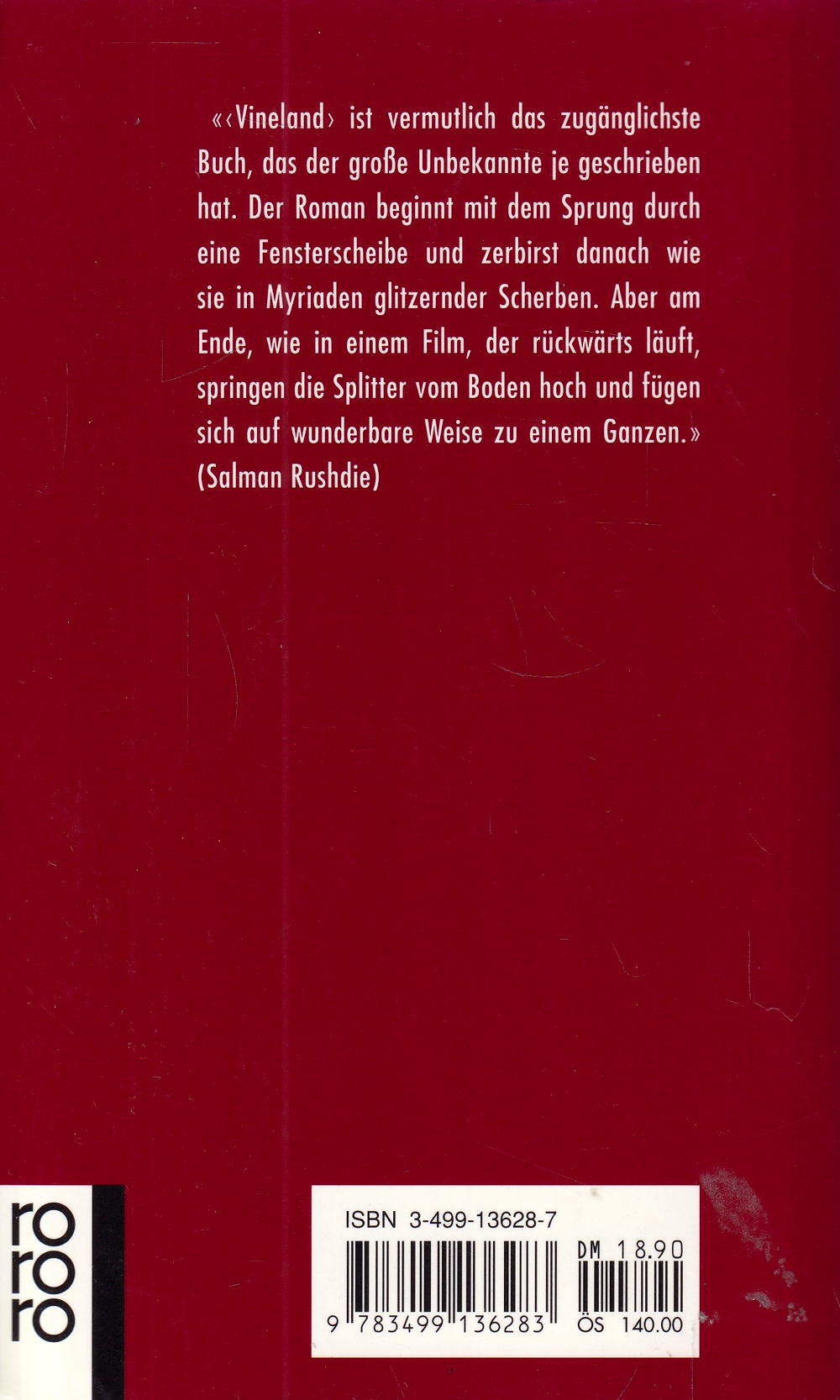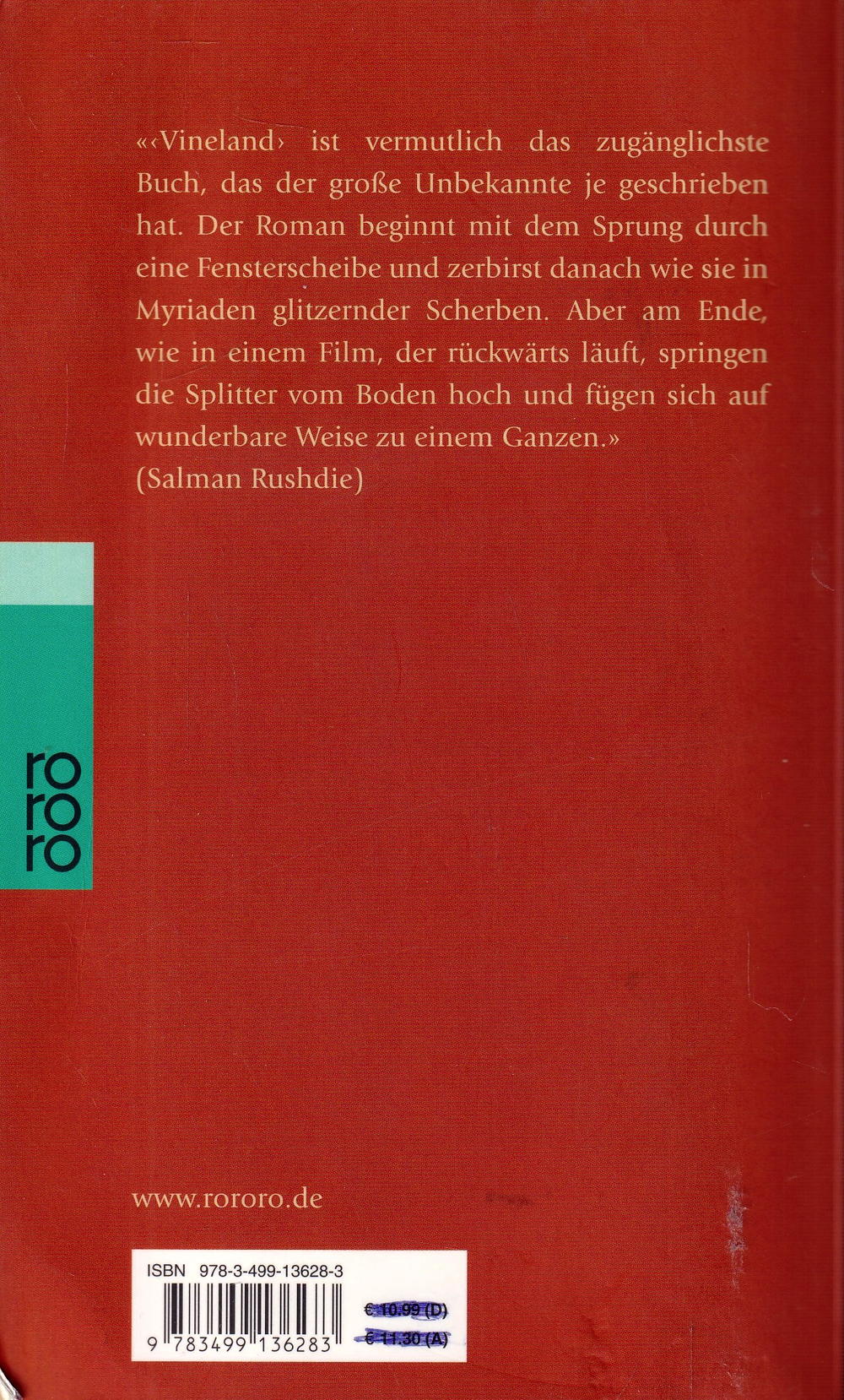 "´Vineland´ ist vermutlich das zugänglichste Buch, das der grosse Unbekannte je geschrieben hat. Der Roman beginnt mit dem Sprung durch eine Fensterscheibe und zerbirst danach wie sie in Myriaden glitzernder Scherben. Aber am Ende, wie in einem Film, der rückwärts läuft, springen die Splitter vom Boden hoch und fügen sich auf wunderbare Weise zu einem Ganzen." (Salman Rushdie)