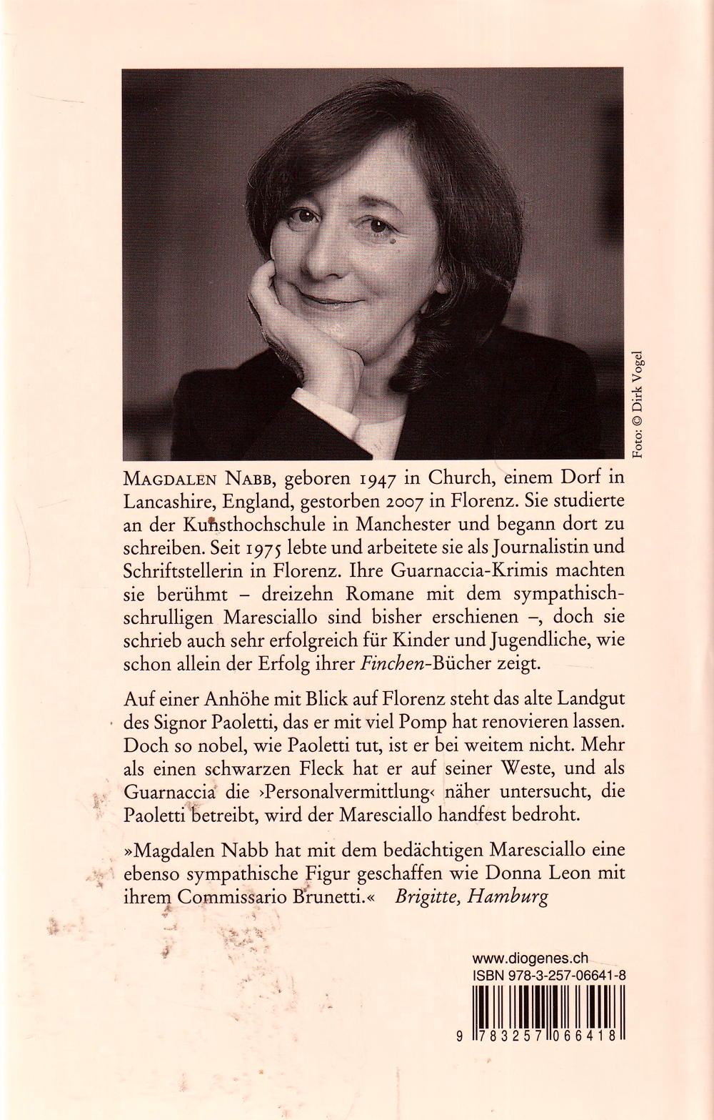 Auf einer Anhöhe mit Blick auf Florenz steht das alte Landgut des Signor Paoletti, das er mit viel Pomp hat renovieren lassen. Doch so nobel, wie Paoletti tut, ist er bei weitem nicht. Mehr als einen schwarzen Fleck hat er auf seiner Weste, und als Guarnaccia die 'Personalvermittlung' näher untersucht, die Paoletti betreibt, wird der Maresciallo handfest bedroht.