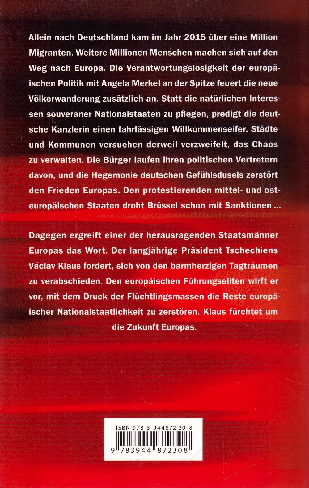Allein nach Deutschland kam im Jahr 2015 über eine Million Migranten. Weitere Millionen Menschen machen sich auf den Weg nach Europa. Die Verantwortungslosigkeit der europäischen Politik mit Angela Merkel an der Spitze feuert die neue Völkerwanderung zusätzlich an. Statt die natürlichen Interessen souveräner Nationalstaaten zu wahren, predigt die deutsche Kanzlerin einen fahrlässigen Willkommenseifer. Städte und Kommunen versuchen derweil verzweifelt, das Chaos zu verwalten. Die Bürger laufen ihren politischen Vertretern davon, und die Hegemonie deutschen Gefühlsdusels zerstört den Frieden Europas. Den protestierenden mittel- und osteuropäischen Staaten droht Brüssel schon mit Sanktionen … Dagegen ergreift einer der herausragenden Staatsmänner Europas das Wort. Der langjährige Präsident Tschechiens Václav Klaus fordert, sich von den barmherzigen Tagträumen zu verabschieden. Den europäischen Führungseliten wirft er vor, mit dem Druck der Flüchtlingsmassen die Reste europäischer Nationalstaatlichkeit zu zerstören. Klaus fürchtet um die Zukunft Europas.