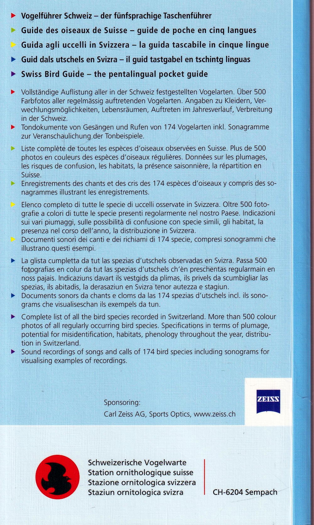 Ein fünfsprachiger Vogelführer mit einer vollständigen Auflistung aller in der Schweiz festgestellten Vogelarten. Über 500 Farbaufnahmen aller regelmässig auftretender Vogelarten