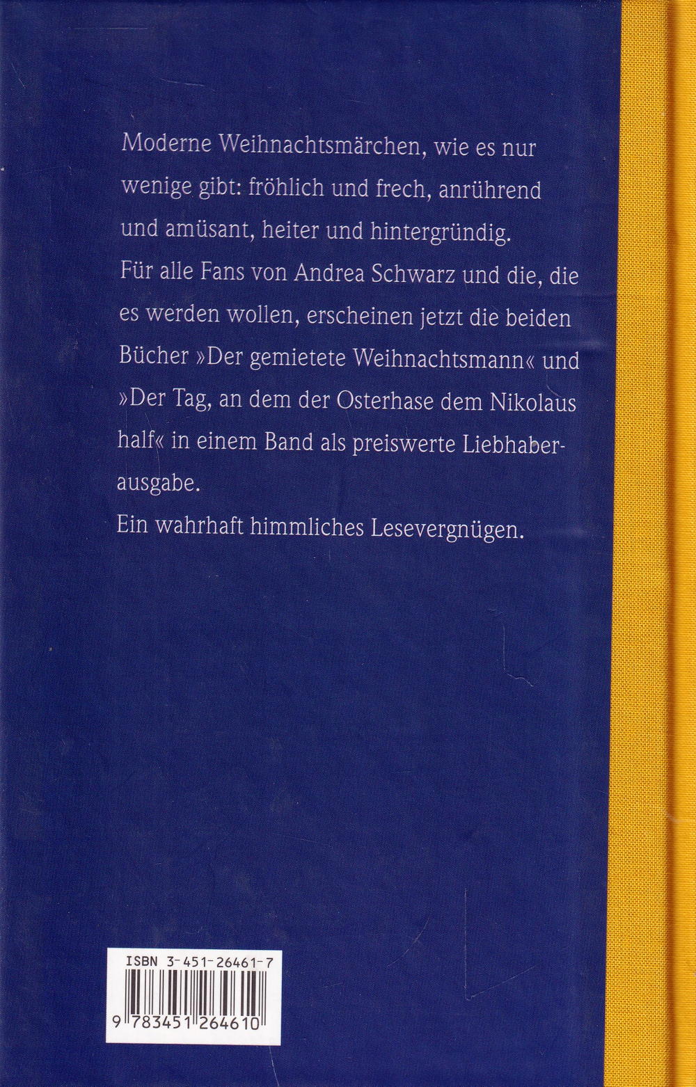 Für alle Fans von Andrea Schwarz und die, die es werden wollen, erscheinen jetzt die beiden Bücher »Der gemietete Weihnachtsmann« und »Der Tag, an dem der Osterhase dem Nikolaus half« in einem Band als preiswerte Liebhaberausgabe.
