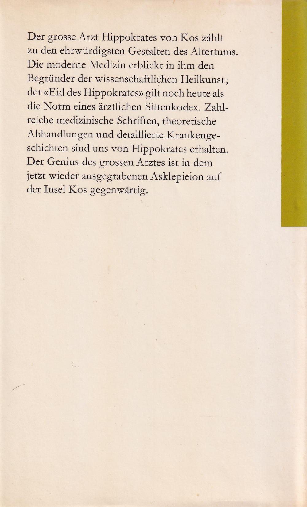 Der grosse Arzt Hippokrates von Kos zählt zu den ehrwürdigsten Gestalten des Altertums. Die moderne Medizin erblickt in ihm den Begründer der wissenschaftlichen Heilkunst; der «Eid des Hippokrates» gilt noch heute als die Norm eines ärztlichen Sittenkodex. Zahlreiche medizinische Schriften, theoretische Abhandlungen und detaillierte Krankengeschichten sind uns von Hippokrates erhalten. Der Genius des grossen Arztes ist in dem jetzt wieder ausgegrabenen Asklepieion auf der Insel Kos gegenwärtig.