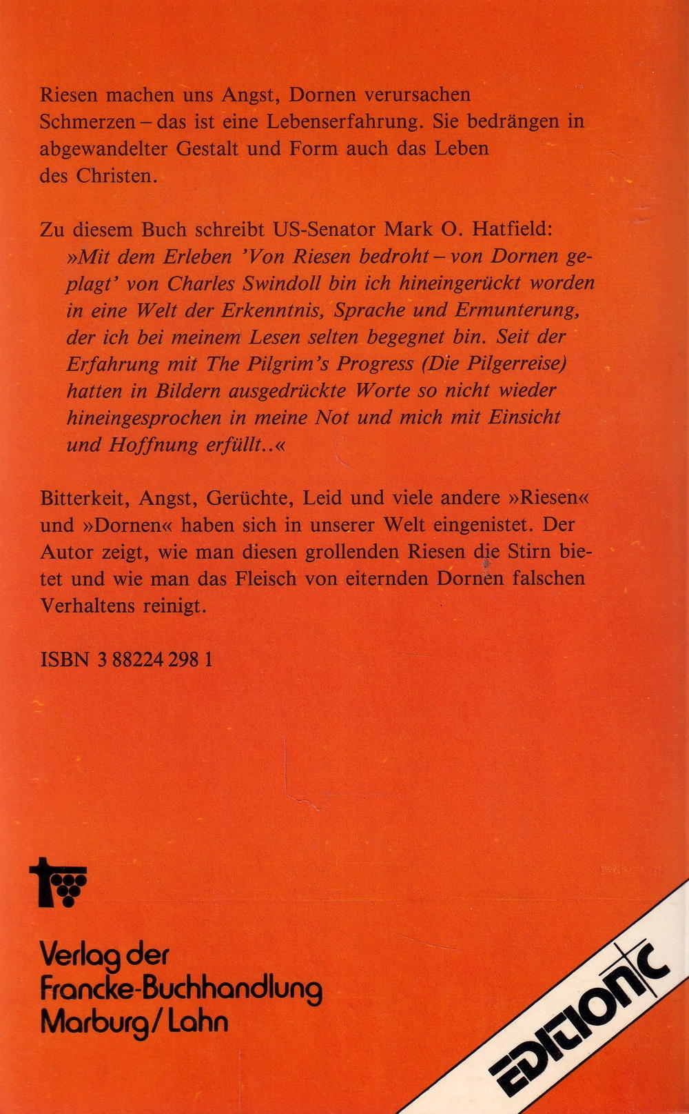 »Mit dem Erleben 'Von Riesen bedroht- von Dornen geplagt' von Charles Swindoll bin ich hineingerückt worden in eine Welt der Erkenntnis, Sprache und Ermunterung, der ich bei meinem Lesen selten begegnet bin. Seit der Erfahrung mit The Pilgrim's Progress (Die Pilgerreise)
