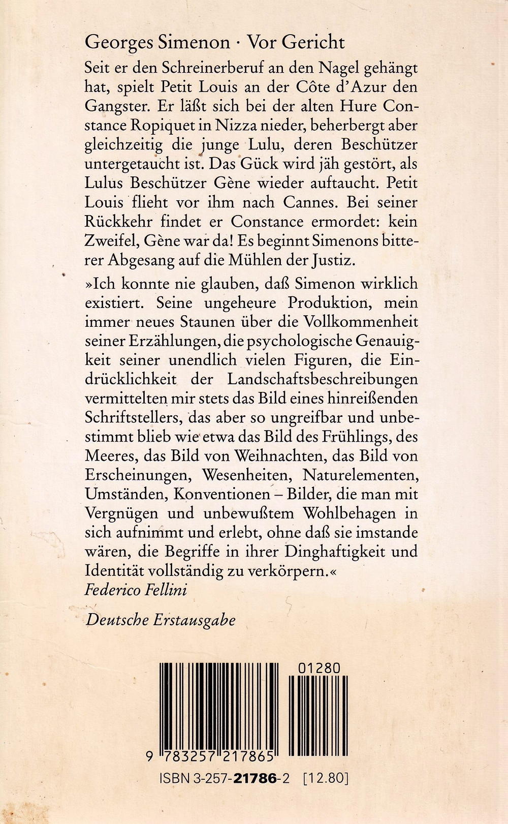 Georges Simenon, geb. am 13. Februar 1903 in Liège/Belgien, begann nach abgebrochener Buchhändlerlehre als Lokalreporter. Nach einer Zeit in Paris als Privatsekretär eines Marquis wohnte er auf seinem Boot, mit dem er bis nach Lappland fuhr, Reiseberichte und erste Maigret-Romane verfassend. Schaffenswut und viele Ortswechsel bestimmten 30 Jahre lang sein Leben, bis er sich am Genfersee niederliess, wo er nach 75 Maigret-Romanen und über 120 Non-Maigrets beschloss, statt Romane ausgreifende autobiographische Arbeiten (wie die monumentalen Intimen Memoiren ) zu diktieren. Er starb am 4. September 1989 in