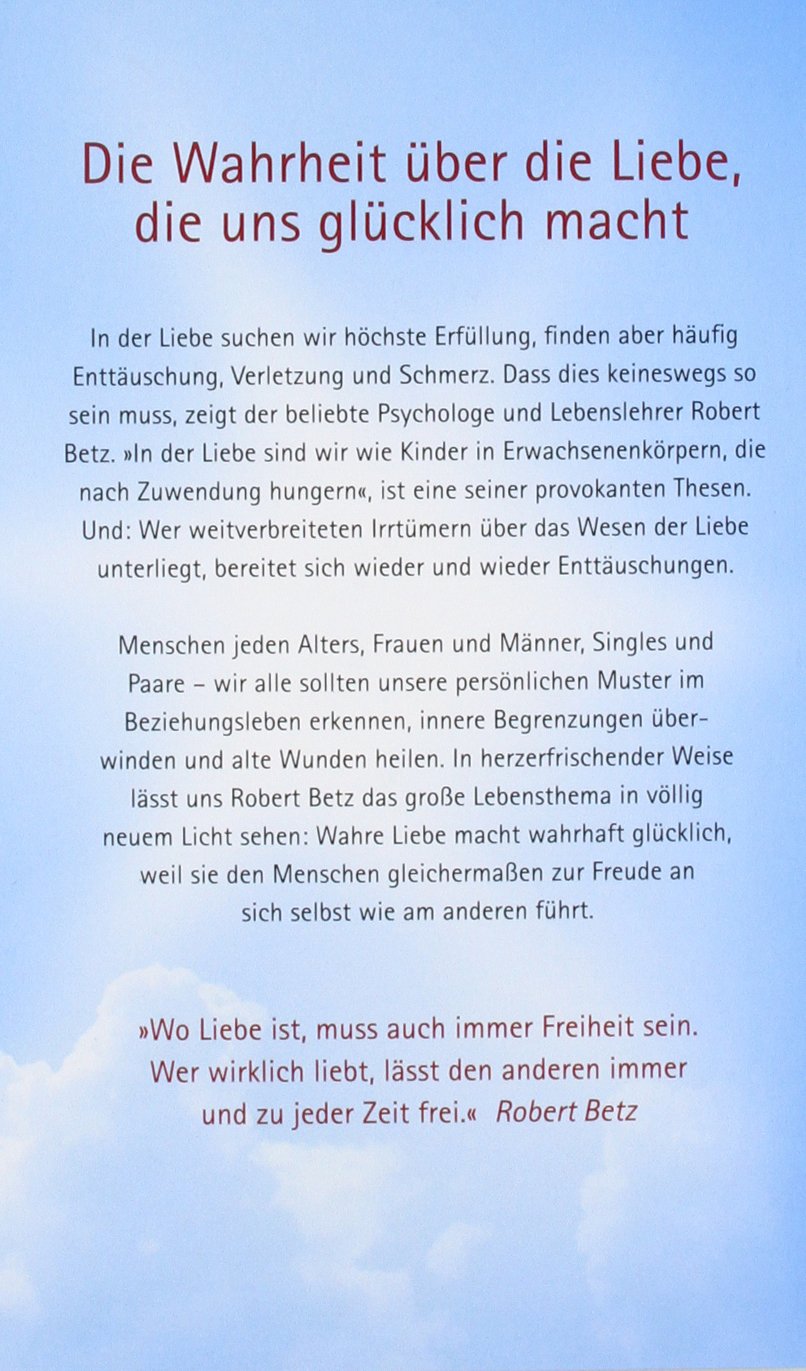 Das Geheimnis wahrer Liebe - und wie wir sie finden Von ihrer Partnerschaft erwarten die Menschen heute alles: Liebe und Freundschaft, Geborgenheit und ekstatische Sexualität, Bindung und Toleranz. "Das kann ja gar nicht klappen!", meint Robert Betz und empfiehlt: "Der Schlüssel zur wahrhaft erfüllenden Liebe ist die Freiheit". Wie wir unser Herz für die wahre Liebe öffnen können, zeigt dieser Beziehungsratgeber für Singles und Paare. Ein Buch, das befähigt, die Liebe vollkommen neu zu entdecken.