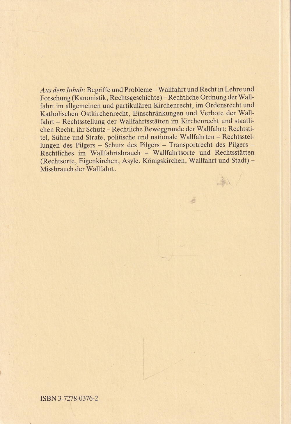 Aus dem Inhalt: Begriffe und Probleme - Wallfahrt und Recht in Lehre und Forschung (Kanonistik, Rechtsgeschichte) - Rechtliche Ordnung der Wallfahrt im allgemeinen und partikulären Kirchenrecht, im Ordensrecht und Katholischen Ostkirchenrecht, Einschränkungen und Verbote der Wallfahrt – Rechtsstellung der Wallfahrtsstätten im Kirchenrecht und staatlichen Recht, ihr Schutz- Rechtliche Beweggründe der Wallfahrt: Rechtstitel, Sühne und Strafe, politische und nationale Wallfahrten - Rechtsstellungen des Pilgers - Schutz des Pilgers - Transportrecht des Pilgers -Wallfahrtsorte und Rechtsstätten Rechtliches im Wallfahrtsbrauch (Rechtsorte, Eigenkirchen, Asyle, Königskirchen, Wallfahrt und Stadt) -Missbrauch der Wallfahrt.