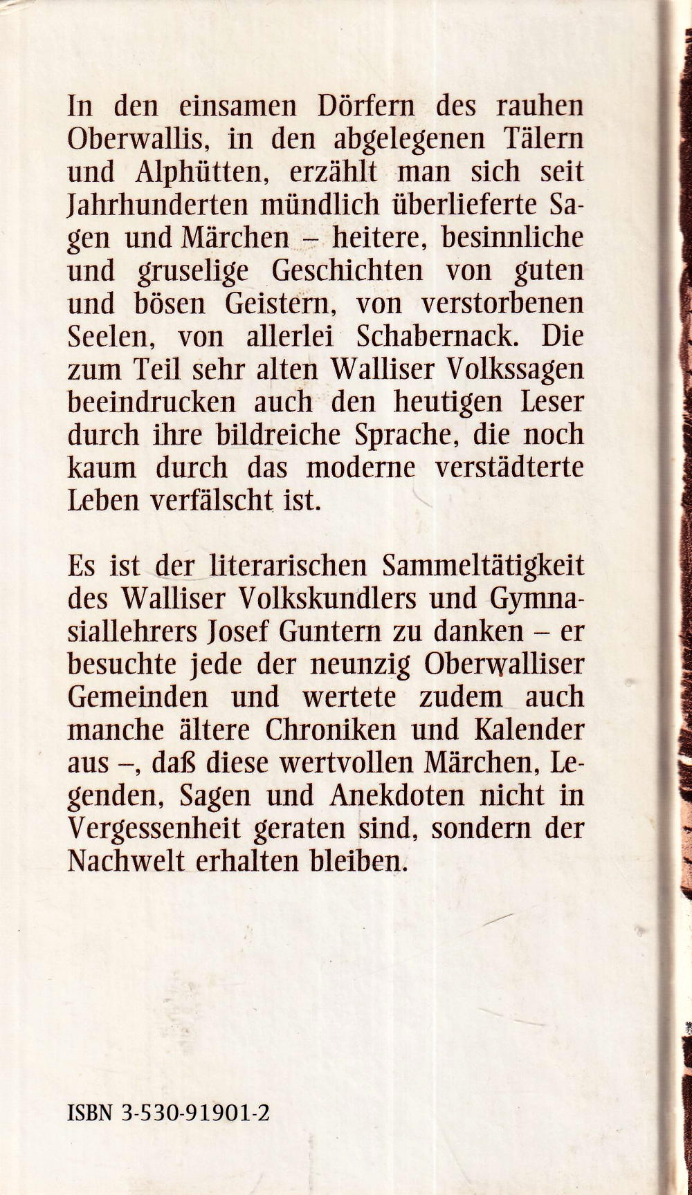 Es ist der literarischen Sammeltätigkeit des Walliser Volkskundlers und Gymnasiallehrers Josef Guntern zu danken - er besuchte jede der neunzig Oberwalliser Gemeinden und wertete zudem auch manche ältere Chroniken und Kalender aus -, dass diese wertvollen Märchen, Legenden, Sagen und Anekdoten nicht in Vergessenheit geraten sind, sondern der Nachwelt erhalten bleiben.