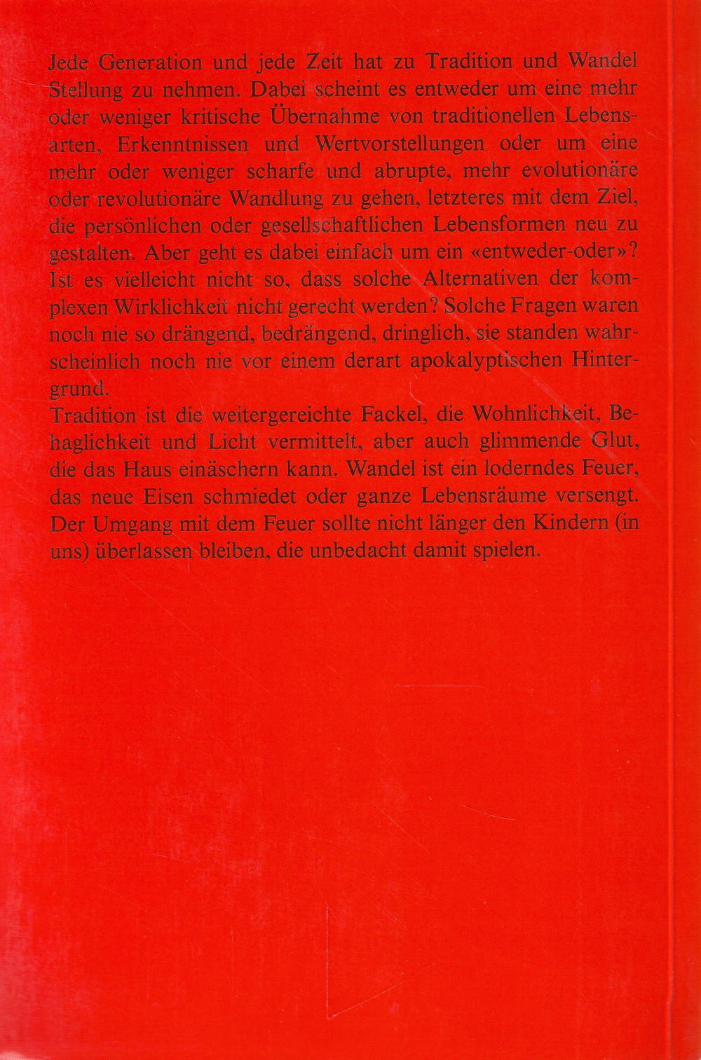 Tradition ist die weitergereichte Fackel, die Wohnlichkeit, Behaglichkeit und Licht vermittelt, aber auch glimmende Glut, die das Haus einäschern kann. Wandel ist ein loderndes Feuer, das neue Eisen schmiedet oder ganze Lebensräume versengt.
