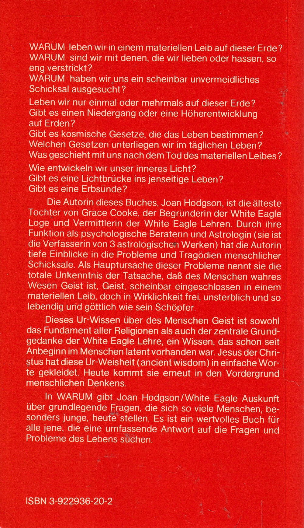 In WARUM gibt Joan Hodgson/White Eagle Auskunft über grundlegende Fragen, die sich so viele Menschen, besonders junge, heute stellen. Es ist ein wertvolles Buch für alle jene, die eine umfassende Antwort auf die Fragen und Probleme des Lebens suchen.