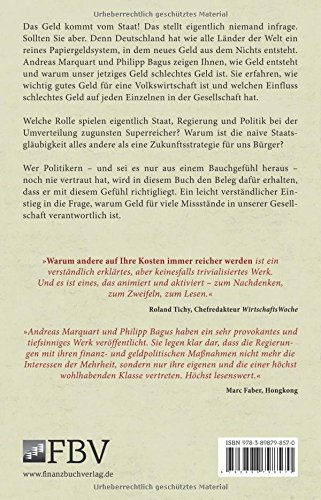 Das Geld kommt vom Staat! Das stellt eigentlich niemand infrage. Sollten Sie aber. Denn Deutschland hat wie alle Länder der Welt ein reines Papiergeldsystem, in dem neues Geld aus dem Nichts entsteht. Andreas Marquart und Philipp Bagus zeigen Ihnen, wie Geld entsteht und warum unser jetziges Geld schlechtes Geld ist. Sie erfahren, wie wichtig gutes Geld für eine Volkswirtschaft ist und welchen Einfluss schlechtes Geld auf jeden Einzelnen in der Gesellschaft hat.