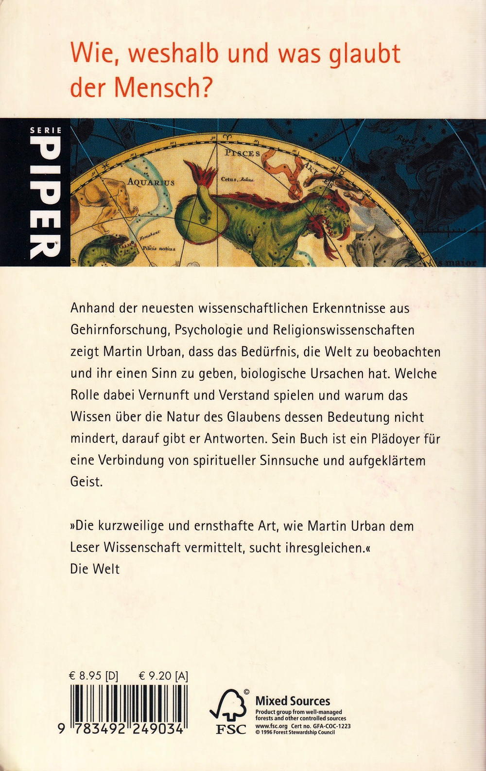 Anhand der neuesten wissenschaftlichen Erkenntnisse aus Gehirnforschung, Psychologie und Religionswissenschaften zeigt Martin Urban, dass das Bedürfnis, die Welt zu beobachten und ihr einen Sinn zu geben, biologische Ursachen hat. Welche Rolle dabei Vernunft und Verstand spielen und warum das Wissen über die Natur des Glaubens dessen Bedeutung nicht mindert, darauf gibt er Antworten. Sein Buch ist ein Plädoyer für eine Verbindung von spiritueller Sinnsuche und aufgeklärtem Geist.