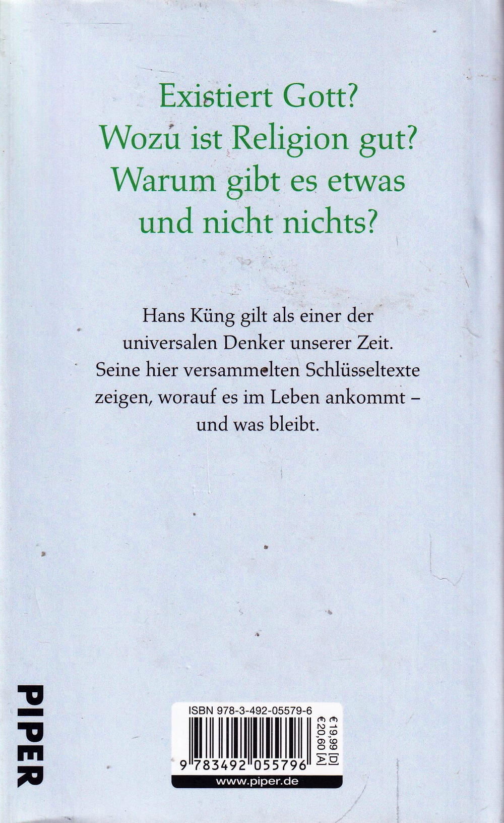 Hans Küng hat mit seinen zahlreichen Veröffentlichungen nicht nur weltweit Millionen von Lesern gefunden, sondern auch die Sicht auf die großen Menschheitsfragen mitbestimmt. Sein denkerischer Weg erstreckt sich von Christentum und Kirche über die Weltreligionen bis hin zu existenziellen Grenzfragen und den weltethischen Standards. Existiert Gott, und was bedeutet »Christsein« heute? Wie kann die Kirche vom Neuen Testament her eine neue Gestalt gewinnen? Wie können die Weltreligionen in Frieden miteinander leben? Welche Werte können wir von ihnen für Politik, Wirtschaft und Erziehung lernen? Die hier versammelten Schlüsseltexte zeigen, worauf es im Leben ankommt – und was bleibt