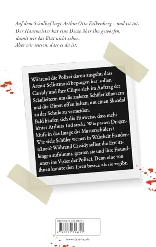 Arthur Otto Falkenberg ist tot. Tot liegt er auf dem Schulhof unter einer Decke, damit man das Blut nicht sieht. Während die Polizei von einem Selbstmord ausgeht, werden Cassidy und ihre Clique von der Schulleiterin gebeten, sich um die anderen Schüler zu kümmern und die Ohren offen zu halten, um einen Skandal an ihrer Schule zu vermeiden. Doch bald häufen sich die Hinweise, dass mehr hinter Arthurs Tod steckt. Wie passen Drogenkäufe in das Image des Musterschülers? Wie viele Tränen der Schüler sind eigentlich Freudentränen? Während Cassidy selbst die Ermittlungen aufnimmt, geraten sie und ihre Clique ins Visier der Polizei. Denn eine von ihnen kannte den Toten besser, als sie zugibt.