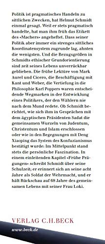 Politik ist pragmatisches Handeln zu sittlichen Zwecken, hat Helmut Schmidt einmal gesagt. Weil er stets pragmatisch handelte, hat man ihm früh das Etikett des "Machers" angeheftet. Dass seiner Politik aber immer ein strenges sittliches Koordinatensystem zugrunde lag, ahnten die wenigsten. Und die Bezugsgrössen in Schmidts ethischer Grundorientierung sind unverrückbar geblieben. Die frühe Lektüre von Mark Aurel und Cicero, die Beschäftigung mit Kant und Weber, die Vertiefung in die Philosophie Karl Poppers sind entscheidende Wegmarken in der Entwicklung eines Politikers, der den Wählern nie nach dem Mund redete. Ob Schmidt berichtet, wie sich ihm in Gesprächen mit dem ägyptischen Präsidenten Sadat die gemeinsamen Wurzeln von Judentum, Christentum und Islam erschlossen oder wie in den Begegnungen mit Deng Xiaoping das System des Konfuzianismus bestätigt wurde: Im Mittelpunkt steht stets die persönliche Faszination. Im einleitenden Kapitel "Frühe Prägungen" schreibt Schmidt über seine Schulzeit, über acht Jahre als Soldat – und über seine Frau Loki.