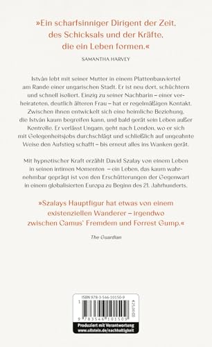 István, fünfzehn, lebt mit seiner Mutter in einem Plattenbauviertel am Rande einer ungarischen Stadt. Er ist schüchtern und es fällt ihm schwer, die sozialen Codes der Gleichaltrigen zu durchschauen. Als sich aus der widerwilligen Bekanntschaft zu einer Nachbarin im Alter seiner Mutter eine sexuelle Beziehung entwickelt, die István selbst kaum begreift, gerät sein Leben ausser Kontrolle. Ein Unfall ereignet sich, ein Mann stirbt. Die Jahre, die folgen, führen István von Ungarn nach London, wo er sich von Job zu Job hangelt und wo jede Abzweigung, die er nimmt, bestimmt ist von den guten oder eigennützigen Absichten Fremder. Während er auf ungeahnte Weise aufsteigt und schliesslich fällt, bleibt István selbst beinahe unbeteiligt am Geschehen, sprachlos – ein stiller Beobachter seines eigenen, turbulenten Lebens. Hypnotisch, mit erschütterndem Nachdruck und grosser Sensibilität erzählt David Szalay von einem Leben in seinen intimen Momenten – ein Leben, das kaum wahrnehmbar geprägt ist von den Erschütterungen der Gegenwart, der Prekarität menschlicher Existenz in einem kalten Europa.