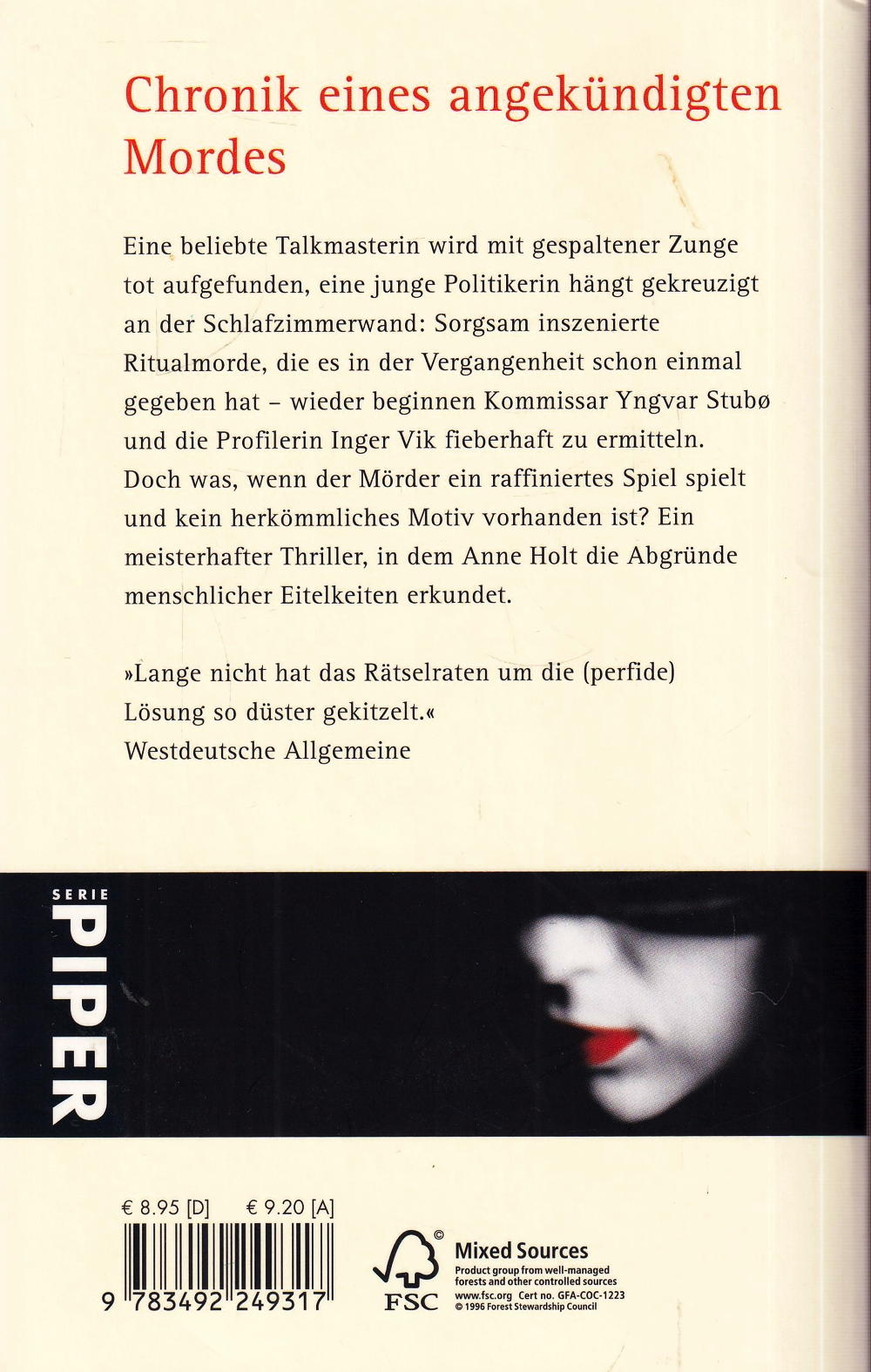 Eine beliebte Talkmasterin wird mit gespaltener Zunge tot aufgefunden, eine junge Politikerin hängt gekreuzigt an der Schlafzimmerwand: Sorgsam inszenierte Ritualmorde, die es in der Vergangenheit schon einmal gegeben hat – wieder beginnen Kommissar Yngvar Stubø und die Profilerin Inger Vik fieberhaft zu ermitteln. Doch was, wenn der Mörder ein raffiniertes Spiel spielt und kein herkömmliches Motiv vorhanden ist? Ein meisterhafter Thriller, in dem Anne Holt die Abgründe menschlicher Eitelkeiten erkundet.