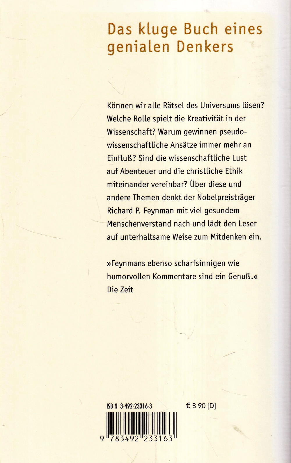 Können die Menschen alle Rätsel des Universums lösen? Welche Rolle spielt die Kreativität in der Wissenschaft? Sind Religion und Wissenschaft vereinbar? Warum gewinnen pseudowissenschaftliche Ansätze und Dogmen immer mehr an Einfluss? Über diese und andere Themen denkt der Physiker Richard Feynman (1918-1985) mit viel gesundem Menschenverstand nach.