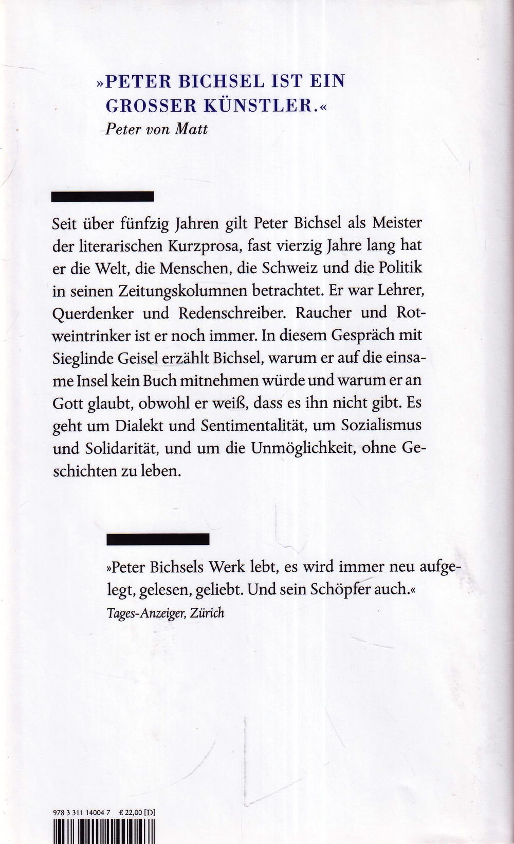 Ich merke, wie ich immer erst eine Geschichte erzähle, bevor ich Ihre Frage beantworte." Peter Bichsel ist ein geborener Erzähler. Und das zeigt er auch im Gespräch mit Sieglinde Geisel: "Ihm fällt immer noch etwas ein, womit ich nicht rechne - der Idealfall von Gespräch." Seit über fünfzig Jahren gilt Bichsel als Meister der literarischen Kurzprosa, fast vierzig Jahre lang hat er die Welt, die Menschen, die Schweiz und die Politik in seinen Zeitungskolumnen betrachtet. Er war Grundschullehrer und Redenschreiber. Querdenker, Raucher und Rotweintrinker ist er noch immer. Über seine Kindergeschichten sagte sein Freund Max Frisch: "Nicht bestrickt zu sein, war unmöglich." Mehrere Tage lang sassen Peter Bichsel und Sieglinde Geisel zusammen, in Bichsels Arbeitszimmer in Solothurn, in seiner Stammkneipe - und sprachen über alles: über die Vorteile der Mundart für das Schreiben, über Sozialismus und Solidarität, warum er auf die einsame Insel kein Buch mitnehmen würde, warum er an Gott glaubt, wohl wissend, dass es ihn nicht gibt, über die Langeweile im Paradies und die Unmöglichkeit, ohne Geschichten zu leben.