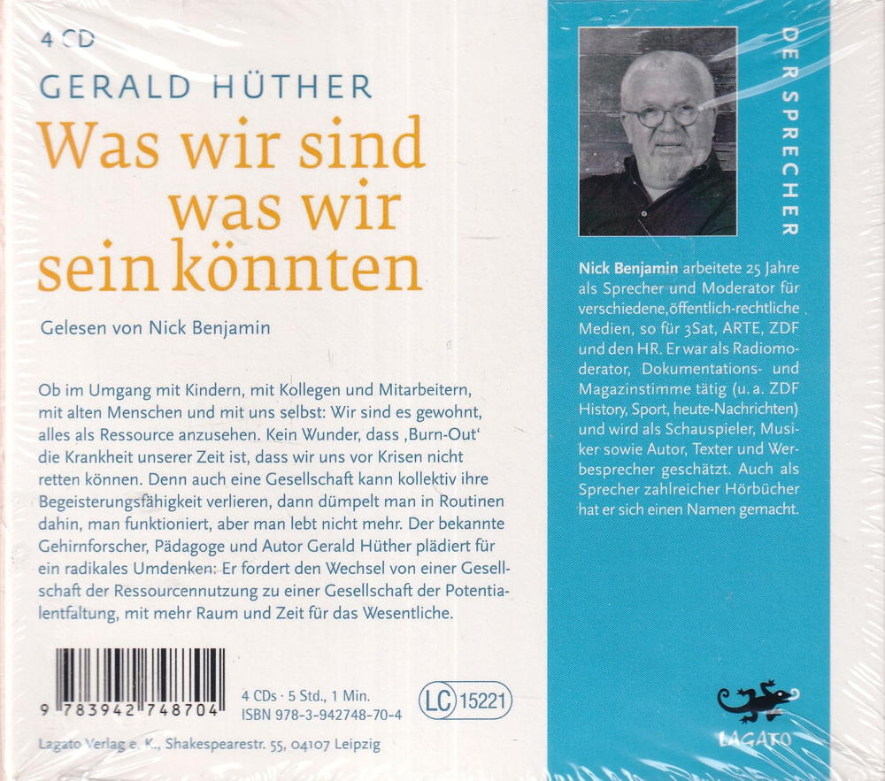 Ob im Umgang mit Kindern, mit Kollegen und Mitarbeitern, mit alten Menschen und mit uns selbst: Wir sind es gewohnt, alles als Ressource anzusehen. Kein Wunder, dass 'Burn-Out' die Krankheit unserer Zeit ist, dass wir uns vor Krisen nicht retten können. Denn auch eine Gesellschaft kann kollektiv ihre Begeisterungsfähigkeit verlieren, dann dümpelt man in Routinen dahin, man funktioniert, aber man lebt nicht mehr. Der bekannte Gehirnforscher, Pädagoge und Autor Gerald Hüther plädiert für ein radikales Umdenken: Er fordert den Wechsel von einer Gesellschaft der Ressourcennutzung zu einer Gesellschaft der Potentialentfaltung, mit mehr Raum und Zeit für das Wesentliche.