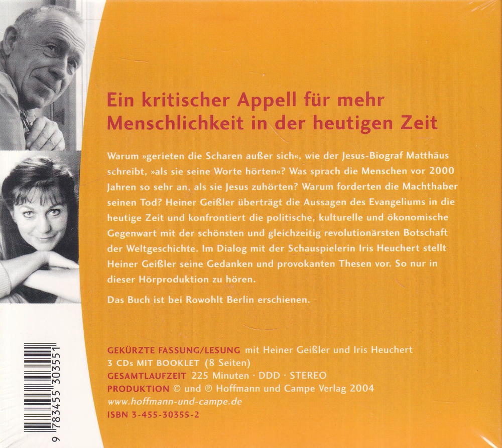 Warum »gerieten die Scharen ausser sich«, wie der Jesus-Biograf Matthäus schreibt, »als sie seine Worte hörten«? Was sprach die Menschen vor 2000 Jahren so sehr an, als sie Jesus zuhörten? Warum forderten die Machthaber seinen Tod? Heiner Geissler überträgt die Aussagen des Evangeliums in die heutige Zeit und konfrontiert die politische, kulturelle und ökonomische Gegenwart mit der schönsten und gleichzeitig revolutionärsten Botschaft der Weltgeschichte. Im Dialog mit der Schauspielerin Iris Heuchert stellt Heiner Geissler seine Gedanken und provokanten Thesen vor. So nur in dieser Hörproduktion zu hören.