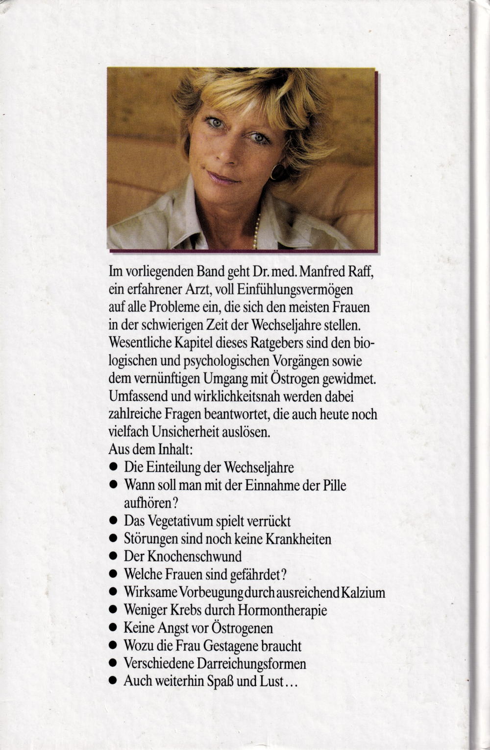 Im vorliegenden Band geht Dr. Med. Manfred Raff, ein erfahrener Arzt, voll Einfühlungsvermögen auf alle Probleme ein, die sich den meisten Frauen in der schwierigen Zeit der Wechseljahre stellen.