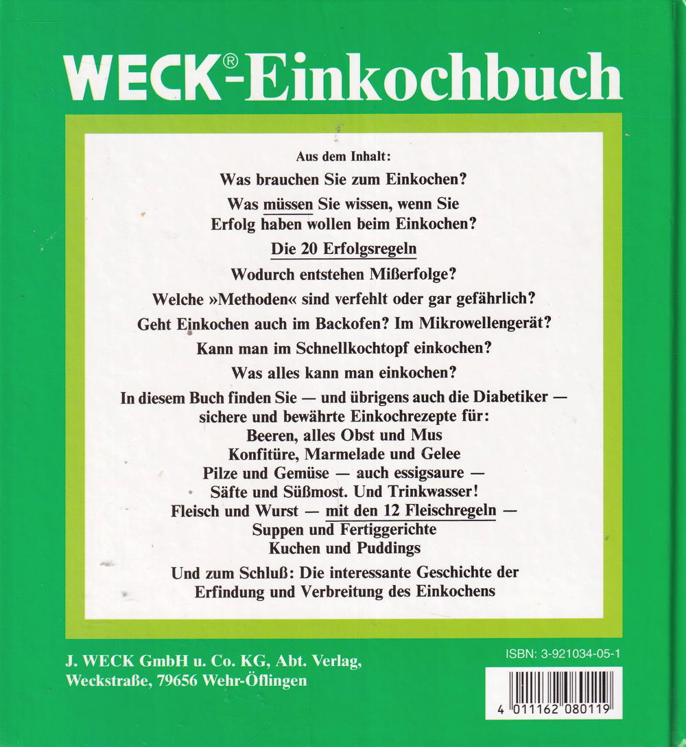 Original WECK Einkochbuch. 144 Seiten mit Rezepten und Tipps rund ums Einkochen. Über 250 neue und altbewährte Rezepte aus der WECK Versuchsküche - egal ob Marmelade, Kompott, Fleischgerichte, Säfte, Gemüse, Suppen, etc. Das Buch erklärt verständlich, mit informativen Zeichnungen und Fotos, wie man Erfolg beim Einkochen hat und welche Fehler man vermeiden sollte.