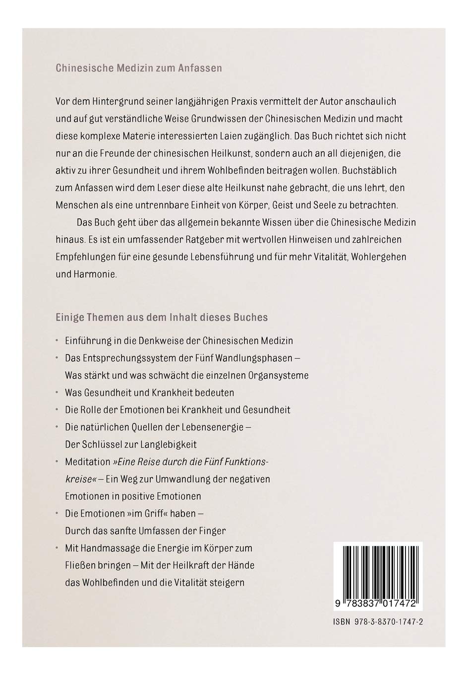 Einige Themen aus dem Inhalt dieses Buches Einführung in die Denkweise der Chinesischen Medizin Das Entsprechungssystem der Fünf Wandlungsphasen - Was stärkt und was schwächt die einzelnen Organsysteme Was Gesundheit und Krankheit bedeuten Die Rolle der Emotionen bei Krankheit und Gesundheit Die natürlichen Quellen der Lebensenergie - Der Schlüssel zur Langlebigkeit Meditation Eine Reise durch die Fünf Funktionskreise - Ein Weg zur Umwandlung der negativen Emotionen in positive Emotionen Die Emotionen im Griff haben - Durch das sanfte Umfassen der Finger Mit Handmassage die Energie im Körper zum Fliessen bringen - Mit der Heilkraft der Hände das Wohlbefinden und die Vitalität steigern
