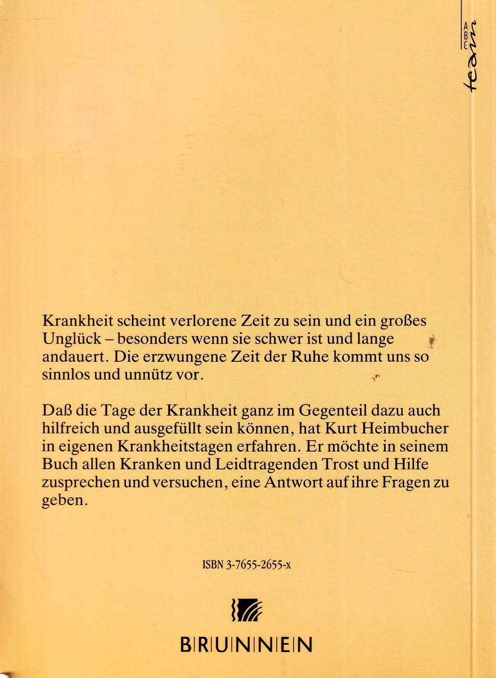 Dass die Tage der Krankheit ganz im Gegenteil dazu auch hilfreich und ausgefüllt sein können, hat Kurt Heimbucher in eigenen Krankheitstagen erfahren. Er möchte in seinem Buch allen Kranken und Leidtragenden Trost und Hilfe zusprechen und versuchen, eine Antwort auf ihre Fragen zu geben.