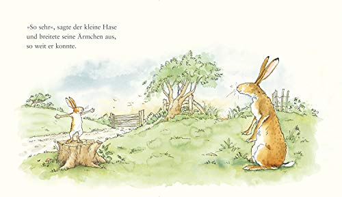 Der kleine Hase hat den grossen Hasen lieb. Wie lieb? Sooo lieb hat er ihn und breitet die Ärmchen aus. Aber die Arme des grossen Hasen reichen weiter. Wie lieb man sich überhaupt haben kann, das zeigt dieses bezaubernde Buch.