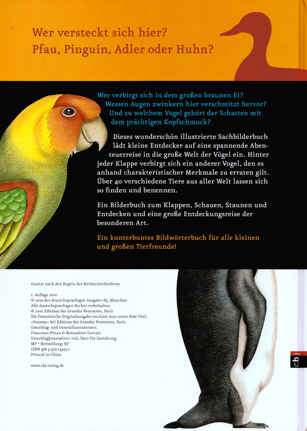 Adler, Rotkehlchen, Pinguin oder Huhn – wer hat sich denn da versteckt? Welcher Vogel zwinkert hier verschmitzt hervor? Wer schlüpft aus diesem grossen blauen Ei? Und zu wem gehört der Schatten mit dem prächtigen Kopfschmuck? Dieses wunderschön illustrierte Sachbilderbuch lädt kleine Entdecker auf eine grosse Abenteuerreise in die schillernde Welt der Vögel ein. Hinter jeder spannenden Klappe verbirgt sich ein anderer Vogel, den es anhand charakteristischer Merkmale zu erraten gilt. So lassen sich über 40 Arten spielerisch erforschen und benennen.