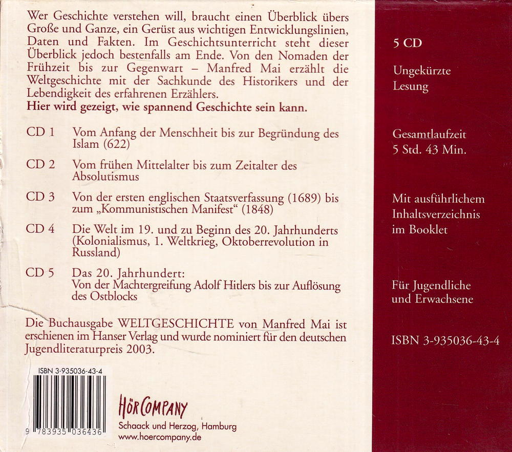 Wer Geschichte verstehen will, braucht einen Überblick übers Grosse und Ganze, ein Gerüst aus wichtigen Entwicklungslinien, Daten und Fakten. Im Geschichtsunterricht steht dieser Überblick jedoch bestenfalls am Ende. Von den Nomaden der Frühzeit bis zur Gegenwart - Manfred Mai erzählt die Weltgeschichte mit der Sachkunde des Historikers und der Lebendigkeit des erfahrenen Erzählers.