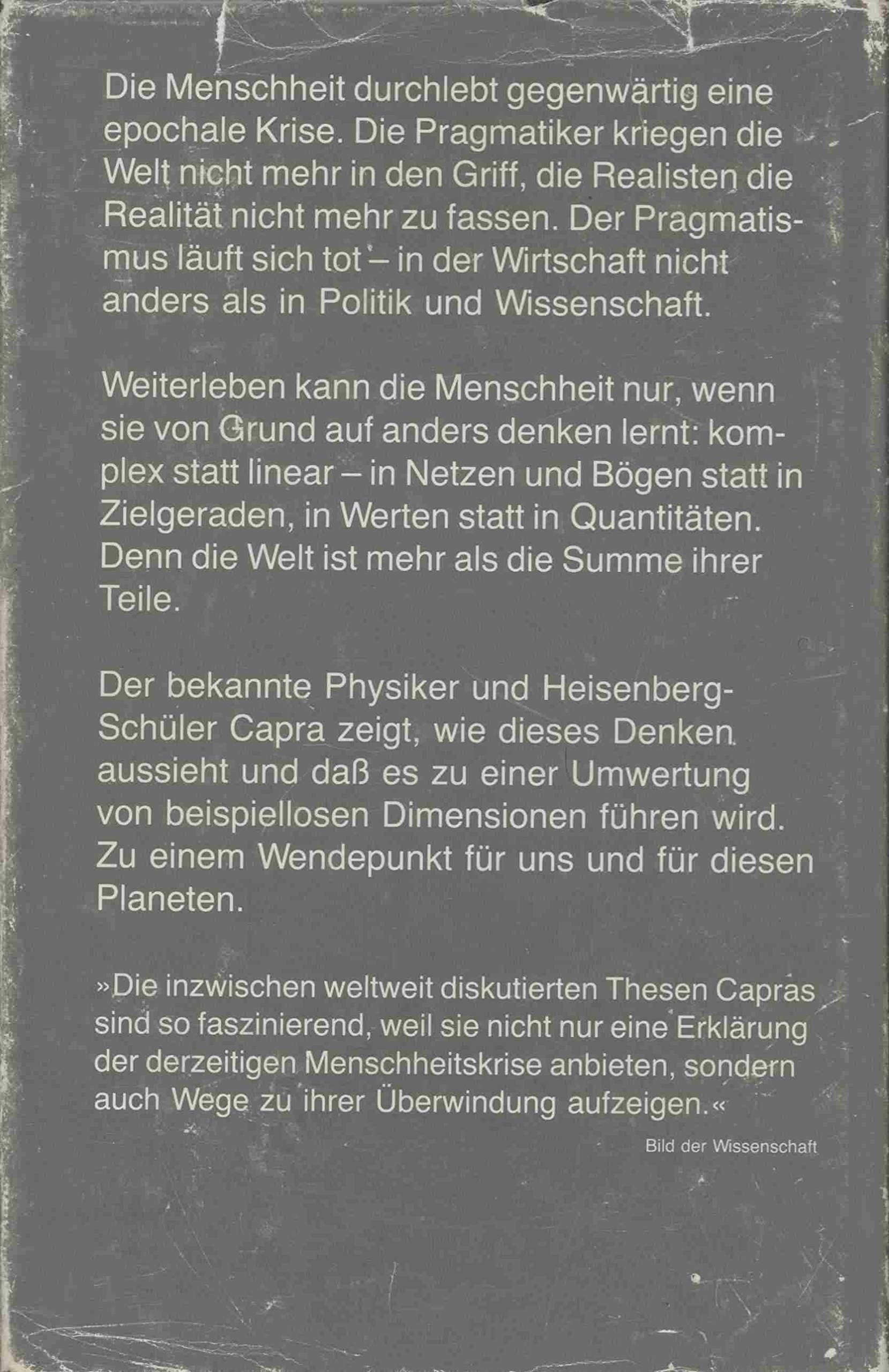 Fritjof Capra setzte mit diesem Buch einen Markstein in der Diskussion um die Zukunft der Menschheit. Wirtschaftskrise, Energiekrise, Rüstungskrise, Umweltkrise - wie viele Krisen soll unser Jahrhundert noch verkraften? Weiterleben kann die Menschheit nur wenn, sie lernt, von Grund auf anders zu denken und zu leben.