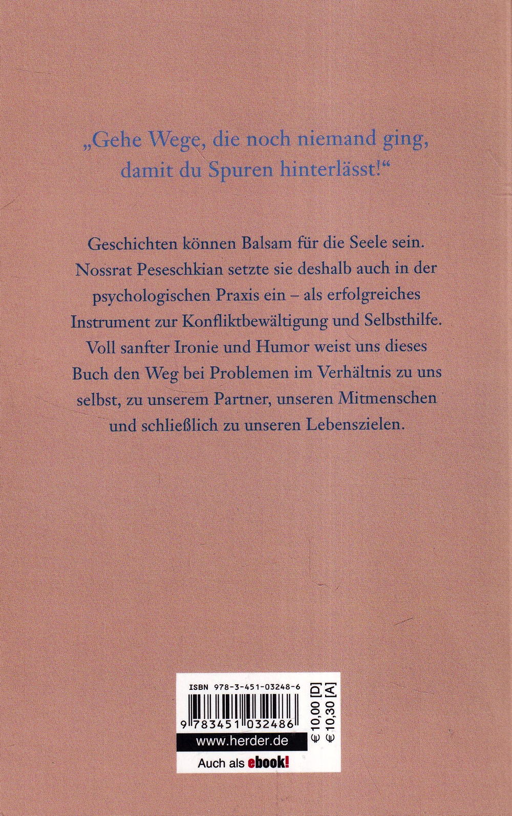 Geschichten können Balsam für die Seele sein. Das wussten schon die Menschen in früheren Zeiten, und diese Erfahrung machen auch die Ärzte und Therapeuten von heute. „Wenn ein Arzt seinen Patienten gute Geschichten erzählt, dann braucht er halb so viel Narkosemittel“, wusste schon der Arzt Ferdinand Sauerbruch. Die orientalischen Geschichten des Begründers der Positiven Psychotherapie, Nossrat Peseschkian, machen deutlich, wie wir von anderen Kulturen lernen können. In scheinbar festgefahrenen Situationen gibt es eine überraschende Perspektive, die den Blick für Neues öffnet. Ein Buch voll sanfter Ironie und Humor.