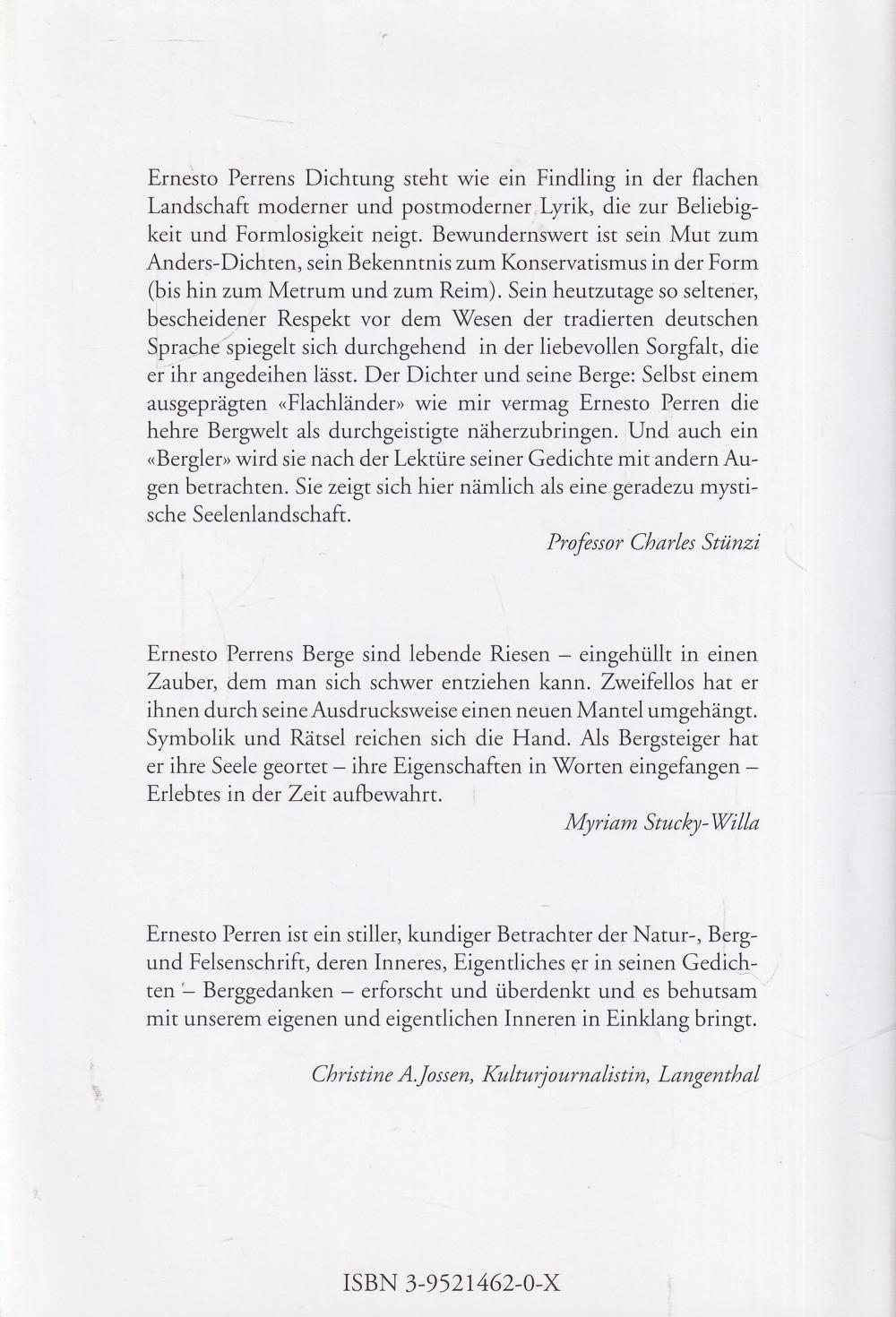 Ernesto Perrens Dichtung steht wie ein Findling in der flachen Landschaft moderner und postmoderner Lyrik, die zur Beliebigkeit und Formlosigkeit neigt. Bewundernswert ist sein Mut zum Anders-Dichten, sein Bekenntnis zum Konservatismus in der Form (bis hin zum Metrum und zum Reim). Sein heutzutage so seltener, bescheidener Respekt vor dem Wesen der tradierten deutschen Sprache spiegelt sich durchgehend in der liebevollen Sorgfalt, die er ihr angedeihen lässt. Der Dichter und seine Berge: Selbst einem ausgeprägten «Flachländer» wie mir vermag Ernesto Perren die hehre Bergwelt als durchgeistigte näherzubringen. Und auch ein «Bergler» wird sie nach der Lektüre seiner Gedichte mit andern Augen betrachten. Sie zeigt sich hier nämlich als eine geradezu mystische Seelenlandschaft.