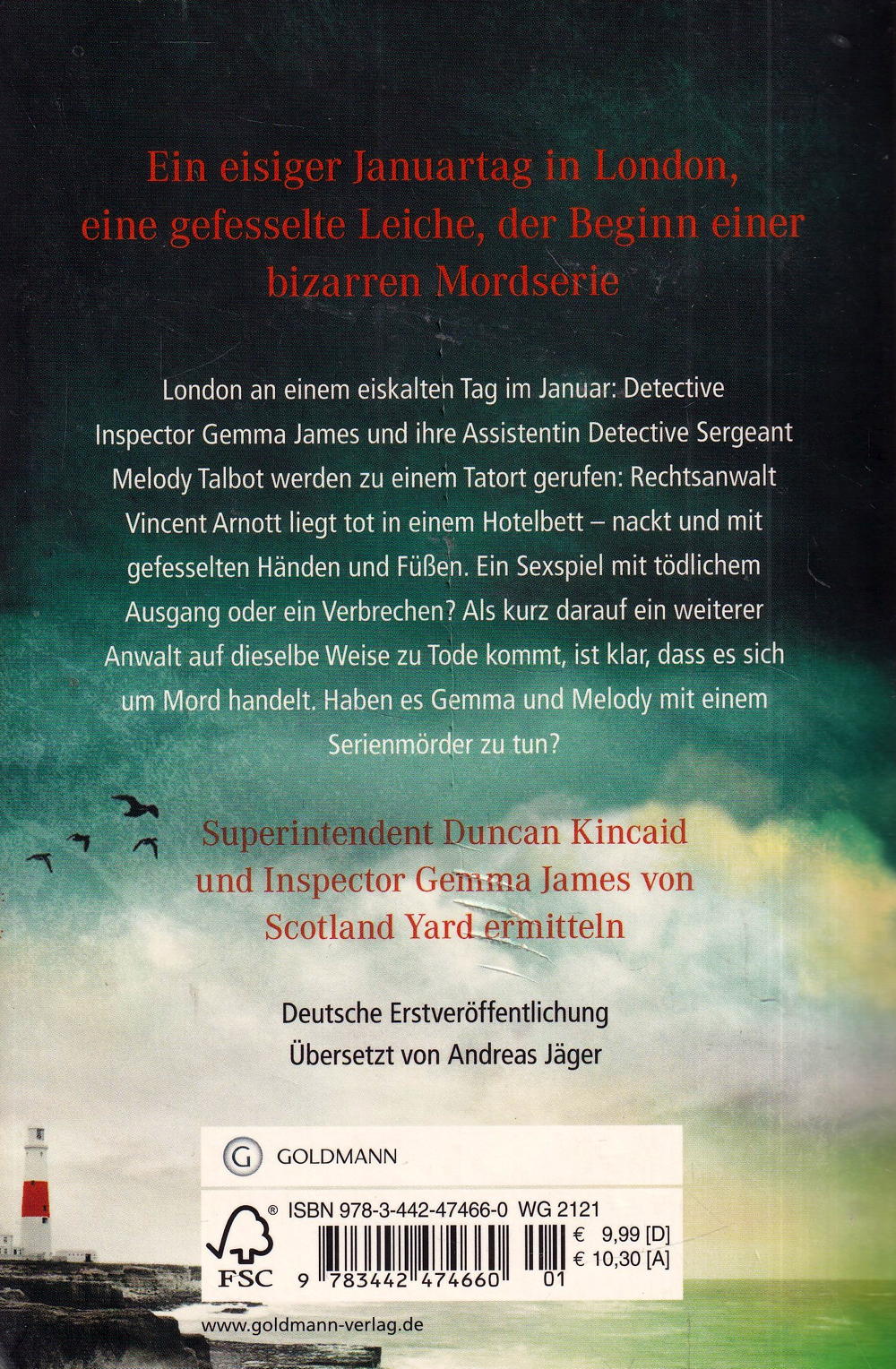 Ein eisiger Januartag in London, eine übel zugerichtete Leiche, der Beginn einer geheimnisvollen Mordserie. London an einem eiskalten Tag im Januar: Detective Inspector Gemma James und ihre Assistentin Detective Sergeant Melody Talbot werden zu einem Tatort gerufen: Rechtsanwalt Vincent Arnott liegt tot in einem Hotelbett – nackt und mit gefesselten Händen und Füssen. Ein Sexspiel mit tödlichem Ausgang oder ein Verbrechen? Als jedoch kurz darauf ein weiterer Anwalt auf dieselbe Weise zu Tode kommt, ist klar, dass es sich um Mord handelt. Haben es Gemma und Melody mit einem Serienmörder zu tun?
