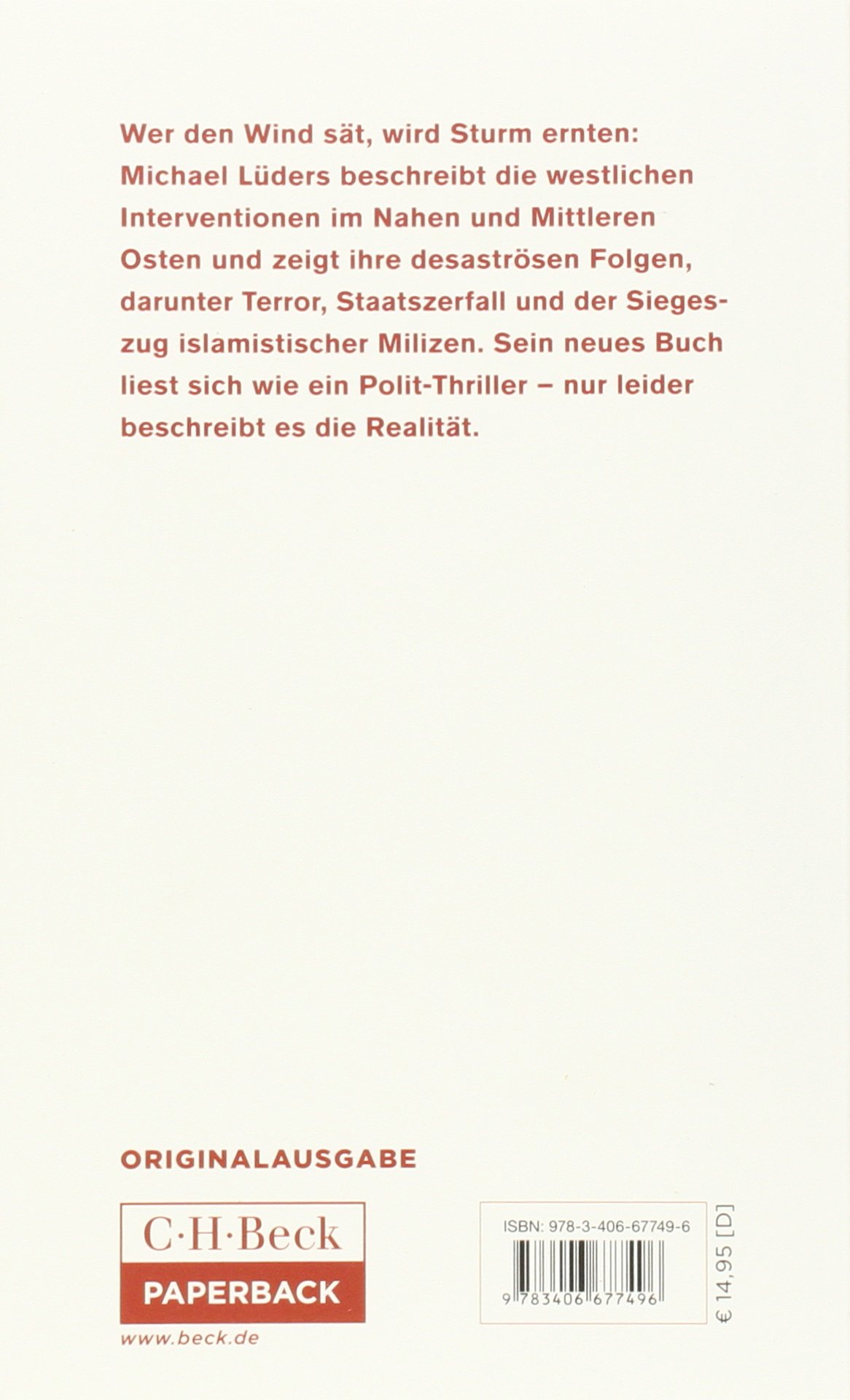 Wer den Wind sät, wird Sturm ernten - Michael Lüders beschreibt die westlichen Interventionen im Nahen und Mittleren Osten seit der Kolonialzeit und erklärt, was sie mit der aktuellen politischen Situation zu tun haben. Sein neues Buch liest sich wie ein Polit-Thriller - nur leider beschreibt es die Realität. Eine Geschichte erscheint in unterschiedlichem Licht, je nachdem, wo man beginnt sie zu erzählen. Und wir sind vergesslich. Das iranische Verhältnis zum Westen versteht nur, wer den von CIA und MI6 eingefädelten Sturz des demokratischen Ministerpräsidenten Mossadegh im Jahr 1953 berücksichtigt. Ohne den Irakkrieg von 2003 und die westliche Politik gegenüber Assad in Syrien lässt sich der Erfolg des "Islamischen Staates" nicht begreifen. Wer wissen will, wie in der Region alles mit allem zusammenhängt, der greife zu diesem Schwarzbuch der westlichen Politik im Orient.