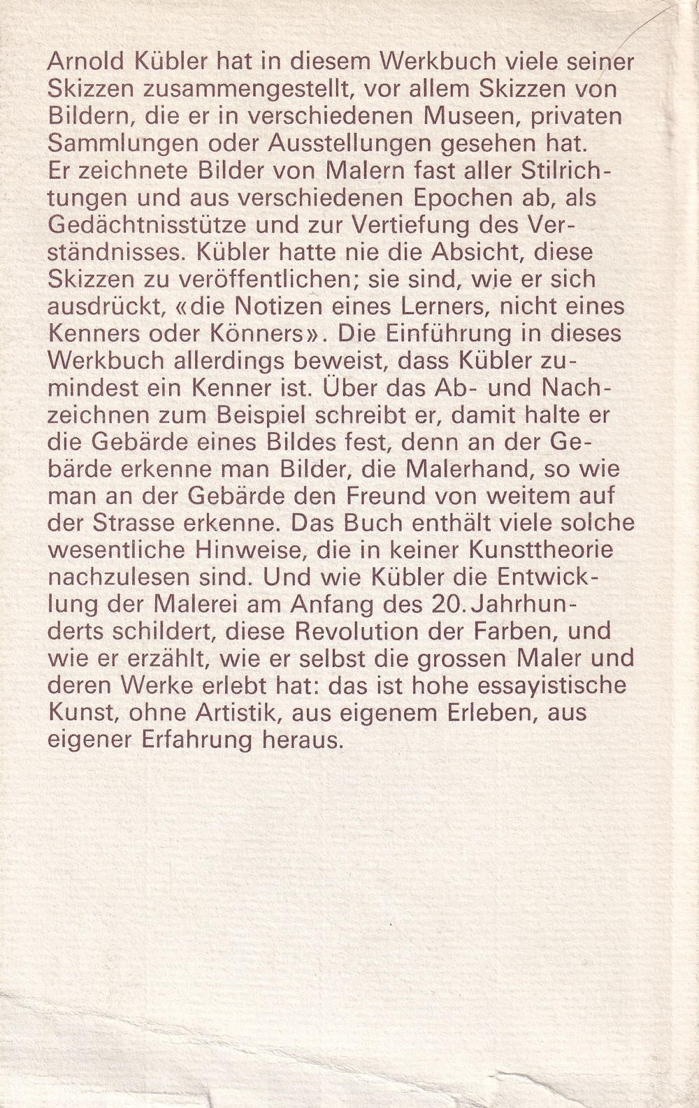Er zeichnete Bilder von Malern fast aller Stilrichtungen und aus verschiedenen Epochen ab, als Gedächtnisstütze und zur Vertiefung des Verständnisses. Kübler hatte nie die Absicht, diese Skizzen zu veröffentlichen; sie sind, wje er sich ausdrückt, «die Notizen eines Lerners, nicht eines Kenners oder Könners». Die Einführung in dieses Werkbuch allerdings beweist, dass Kübler zumindest ein Kenner ist. Über das Ab- und Nachzeichnen zum Beispiel schreibt er, damit halte er die Gebärde eines Bildes fest, denn an der Gebärde erkenne man Bilder, die Malerhand, so wie man an der Gebärde den Freund von weitem auf der Strasse erkenne. Das Buch enthält viele solche wesentliche Hinweise, die in keiner Kunsttheorie nachzulesen sind. Und wie Kübler die Entwicklung der Malerei am Anfang des 20. Jahrhunderts schildert, diese Revolution der Farben, und wie er erzählt, wie er selbst die grossen Maler und deren Werke erlebt hat: das ist hohe essayistische Kunst, ohne Artistik, aus eigenem Erleben, aus eigener Erfahrung heraus.