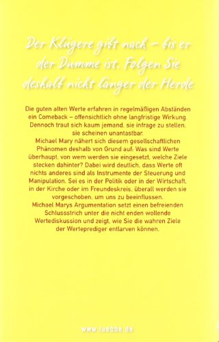 Michael Mary nähert sich diesem gesellschaftlichen Phänomen deshalb von Grund auf: Was sind Werte überhaupt, von wem werden sie eingesetzt, welche Ziele stecken dahinter? Dabei wird deutlich, dass Werte oft nichts anderes sind als Instrumente der Steuerung und Manipulation. Sei es in der Politik oder in der Wirtschaft, in der Kirche oder im Freundeskreis, überall werden sie vorgeschoben, um uns zu beeinflussen.