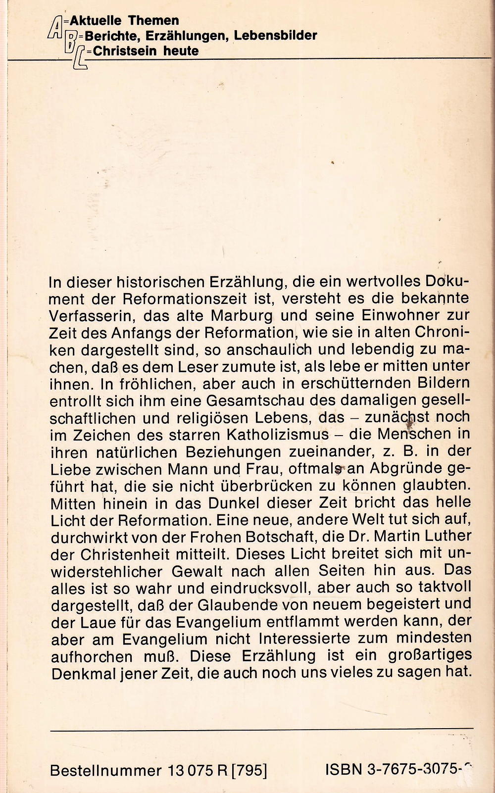 In dieser historischen Erzählung, die ein wertvolles Dokument der Reformationszeit ist, versteht es die bekante Verfasserin, das alte Marburg und seine Einwohner zur Zeit des Anfangs der Reformation, wie sie in alten Chroniken dargestellt sind, so anschaulich und lebendig zu machen, dass es dem Leser zumute ist, als lebe er mitten unter ihnen. In fröhlichen, aber auch in erschütternden Bildern entrollt sich ihm eine Gesamtschau des damaligen gesellschaftlichen und religiösen Lebens, das – zunächst noch im Zeichen des starren Katholizismus – die Menschen in ihren natürlichen Beziehungen zueinander, z. B. In der Liebe zwischen Mann und Frau, oftmals an Abgründe geführt hat, die sie nicht überbrücken zu können glaubten.