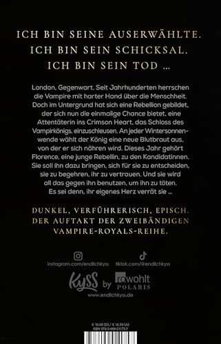 London, Gegenwart. Seit Jahrhunderten herrschen die Vampire mit harter Hand über die Menschheit. Doch im Untergrund hat sich eine Rebellion gebildet. Eine Gruppe von Menschen, die nicht länger bereit ist, diese Unterdrückung hinzunehmen. Auch Florence ist Teil des Widerstands und wurde von Geburt an auf ihre bevorstehende Aufgabe vorbereitet. Mit ihr hat die Rebellion erstmals die Chance, eine Attentäterin ins Crimson Heart, das Schloss des Vampirkönigs, einzuschleusen. An jeder Wintersonnenwende wählt der König eine neue Blutbraut aus, von der er sich nähren wird. Und dieses Jahr gehört Florence zu den Kandidatinnen. Sie soll ihn dazu bringen, sich für sie zu entscheiden, sie zu begehren, ihr zu vertrauen. Und sie wird all das gegen ihn benutzen, um ihn zu töten. Es sei denn, ihr eigenes Herz verrät sie …
