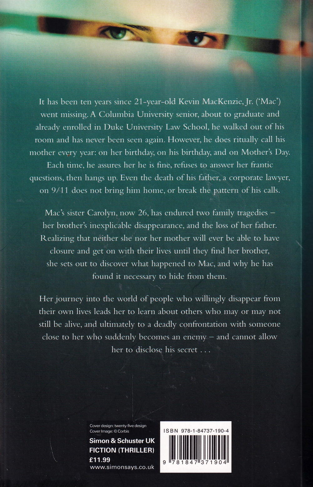 Her journey into the world of people who willingly disappear from their own lives leads her to learn about others who may or may not still be alive, and ultimately to a deadly confrontation with someone close to her who suddenly becomes an enemy - and cannot allow her to disclose his secret...