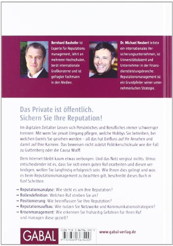 Warum ist es wichtig, was andere über mich denken? Weil Privates heute öffentlich ist und ein schlechter Ruf gesellschaftliche Ausgrenzung bedeutet. Und ist der Ruf erst ruiniert – adé Karriere und Erfolg. Rufmord und eine schlechte Reputation lauern im Internet an jeder Ecke. Ein jahrelang mühevoll aufgebauter Ruf ist heute innerhalb von Tagen ruiniert, das haben von Guttenberg und Strauss-Kahn deutlich gemacht. Wie sich ein guter Ruf aufbauen und dauerhaft bewahren lässt, zeigen die beiden Reputationsexperten Bernhard Bauhofer und Michael Neubert. Sie betrachten das Thema über den gesamten Lebensweg – von der Ausbildung bis zur beruflichen Karriereleiter, von der Partnersuche bis zum sozialen und kulturellen Engagement. Zudem gewähren sie einen Einblick in die Geheimnisse von Reputationsstars wie Steve Jobs und Juanes, dem kolumbianischen Weltstar und Friedensaktivisten. Ein wertvoller Ratgeber mit vielen, einfach umSetzbaren Tipps für den beruflichen und privaten Alltag. Ein Reputations-Check für alle Situationen im realen und virtuellen Leben.