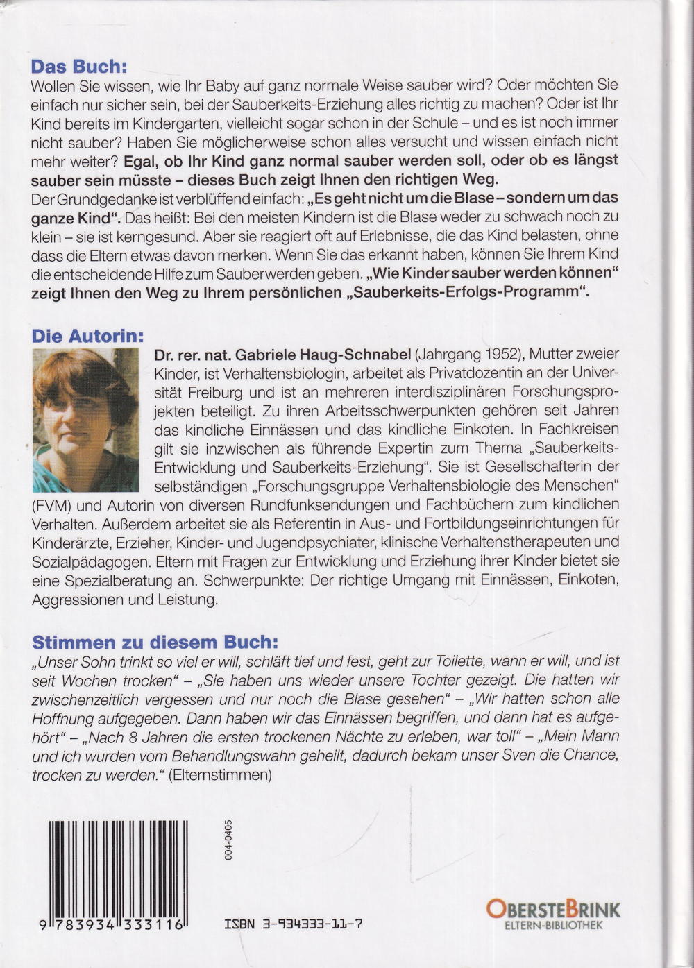 Dr. rer. nat. Gabriele Haug-Schnabel, Mutter zweier Kinder, ist Verhaltensbiologin, arbeitet als Lehrbeauftragte an der Universität Freiburg und ist an mehreren interdisziplinären Forschungsprojekten beteiligt. Zwei ihrer Arbeitsschwerpunkte sind seit Jahren das 'kindliche Einnässen' und '"Schutz-Erziehung'. In Fachkreisen gilt sie als führende Expertin zu den Themen 'Sauberkeits-Entwicklung und Sauberheits-Erziehung' und 'Schutz-Erziehung'. Sie ist Inhaberin der selbständigen "Forschungsgruppe Verhaltensbiologie des Menschen" (FVM) und Autorin von diversen Rundfunksendungen und Fachbüchern zum kindlichen Verhalten. Ausserdem arbeitet sie als Referentin in Aus- und Fortbildungseinrichtungen für Kinder- und Jugendärzte, Erzieher, Kinder- und Jugendpsychater, klinische Verhaltenstherapeuten und Sozialpädagogen. Eltern mit Fragen zur Entwicklung und Erziehung ihrer Kinder bietet sie eine Spezialberatung an. Schwerpunkte: Der richtige Umgang mit Einnässen, Aggressionen und Leistungsproblemen. Dr. Gabriele Haug-Schnabel ist auch Autorin mehrerer Fachbücher zum kindlichen Verhalten.
