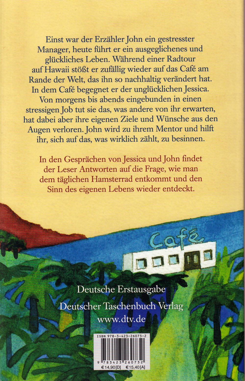 Einst war der Erzähler John ein gestresster Manager, heute führt er ein ausgeglichenes und glückliches Leben. Während einer Radtour auf Hawaii erinnert sich John an den Tag vor zehn Jahren, der sein Leben radikal verändert hat. Damals war er zufällig auf das Café am Rande der Welt gestossen. Und obwohl er sich nun an einem völlig anderen Ort befindet, Tausende Kilometer entfernt, sieht er es plötzlich wieder. In dem Café begegnet er der attraktiven Jessica, die unglücklich mit ihrem Leben ist. Eingebunden in ein stressiges Arbeitsleben tut sie das, was andere von ihr erwarten, hat dabei aber ihre eigenen Ziele und Wünsche aus den Augen verloren. John wird zu ihrem Mentor und hilft ihr, sich auf den Sinn ihres Lebens zu besinnen.
