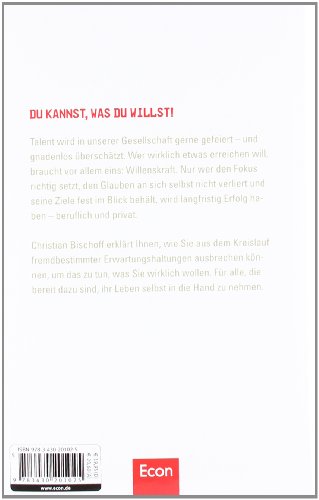 Talent wird in unserer Gesellschaft gerne gefeiert, aber massiv überschätzt. Wissen, Körperkraft, Intelligenz und Geschicklichkeit reichen für maximal 20 % des Erfolgs. Wer sich aber auf das konzentriert was er wirklich will, kommt wesentlich weiter. Dieses Buch zeigt, was man mit Willen alles erreichen kann, welchen Einfluss die Willenskraft auf das eigene Leben hat, und warum Erfolg, Glück und Erfüllung im Kopf eines Menschen entschieden werden. „Wenn Sie Christian Bischoff als Redner buchen möchten, kontaktieren Sie bitte die Econ Referenten-Agentur.“