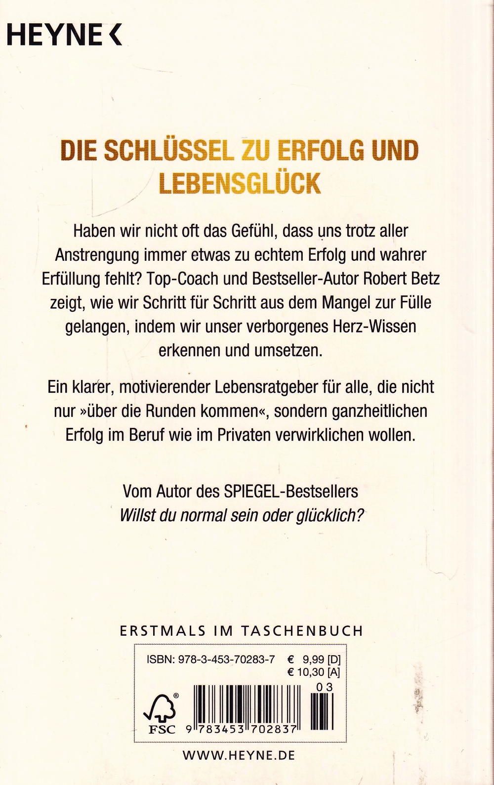 Robert Betz zeigt, wie wir solche Mangelzustände verwandeln - und Erfolg, Fülle und Erfüllung erschaffen und geniessen können. Dabei beschränkt er sich nicht nur auf die Ebene der Gedanken, sondern bezieht vor allem die emotionale und spirituelle Seite mit ein: das Wissen unseres Herzens. Wer lernt, auf sein Herz zu hören und ihm treu zu sein, wird erstaunt und dankbar grossartige Veränderungen in sich und seinem Leben erfahren.