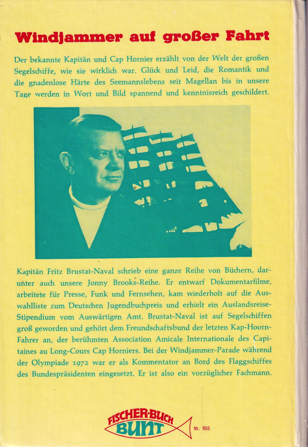 Kapitän Fritz Brustat-Naval schrieb eine ganze Reihe von Büchern, darunter auch unsere Jonny Brooks-Reihe. Er entwarf Dokumentarfilme, arbeitete für Presse, Funk und Fernsehen, kam wiederholt auf die Auswahlliste zum Deutschen Jugendbuchpreis und erhielt ein Auslandsreise-Stipendium vom Auswärtigen Amt. Brustat-Naval ist auf Segelschiffen gross geworden und gehört dem Freundschaftsbund der letzten Kap-Hoorn-Fahrer an, der berühmten Association Amicale Internationale des Capitaines au Long-Cours Cap Horniers. Bei der Windjammer-Parade während der Olympiade 1972 war er als Kommentator an Bord des Flaggschiffes des Bundespräsidenten eingesetzt. Er ist also ein vorzüglicher Fachmann.