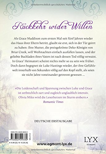Als Grace Madison zum ersten Mal seit fünf Jahren wieder das Haus ihrer Eltern betritt, glaubt sie erst, sich in der Tür geirrt zu haben: Ihre Mutter, die preisgekrönte Deko-Königin von Briar Creek, will Weihnachten einfach ausfallen lassen, und der geliebte Buchladen ihres Vaters ist nach dessen Tod völlig verwaist. In ihrem Heimatort scheint nichts mehr so zu sein wie früher. Doch dann begegnet sie Luke Hastings wieder, der ihre Gefühlswelt innerhalb von Sekunden völlig auf den Kopf stellt, als seien sie nicht Jahre voneinander getrennt gewesen...Die Leidenschaft und Spannung zwischen Luke und Grace ist zerbrechlich zart und zugleich unglaublich intensiv. Olivia Miles wird die Leserherzen im Sturm erobern.