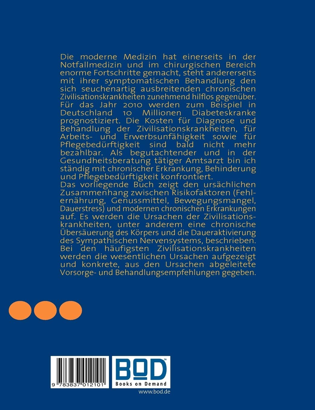 Das vorliegende Buch zeigt den ursächlichen Zusammenhang zwischen Risikofaktoren (Fehl-ernährung, Genussmittel, Bewegungsmangel, Dauerstress) und modernen chronischen Erkrankungen auf. Es werden die Ursachen der Zivilisations-krankheiten, unter anderem eine chronische Übersäuerung des Körpers und die Daueraktivierung des Sympathischen Nervensystems, beschrieben. Bei den häufigsten Zivilisationskrankheiten werden die wesentlichen Ursachen aufgezeigt und konkrete, aus den Ursachen abgeleitete Vorsorge- und Behandlungsempfehlungen gegeben.